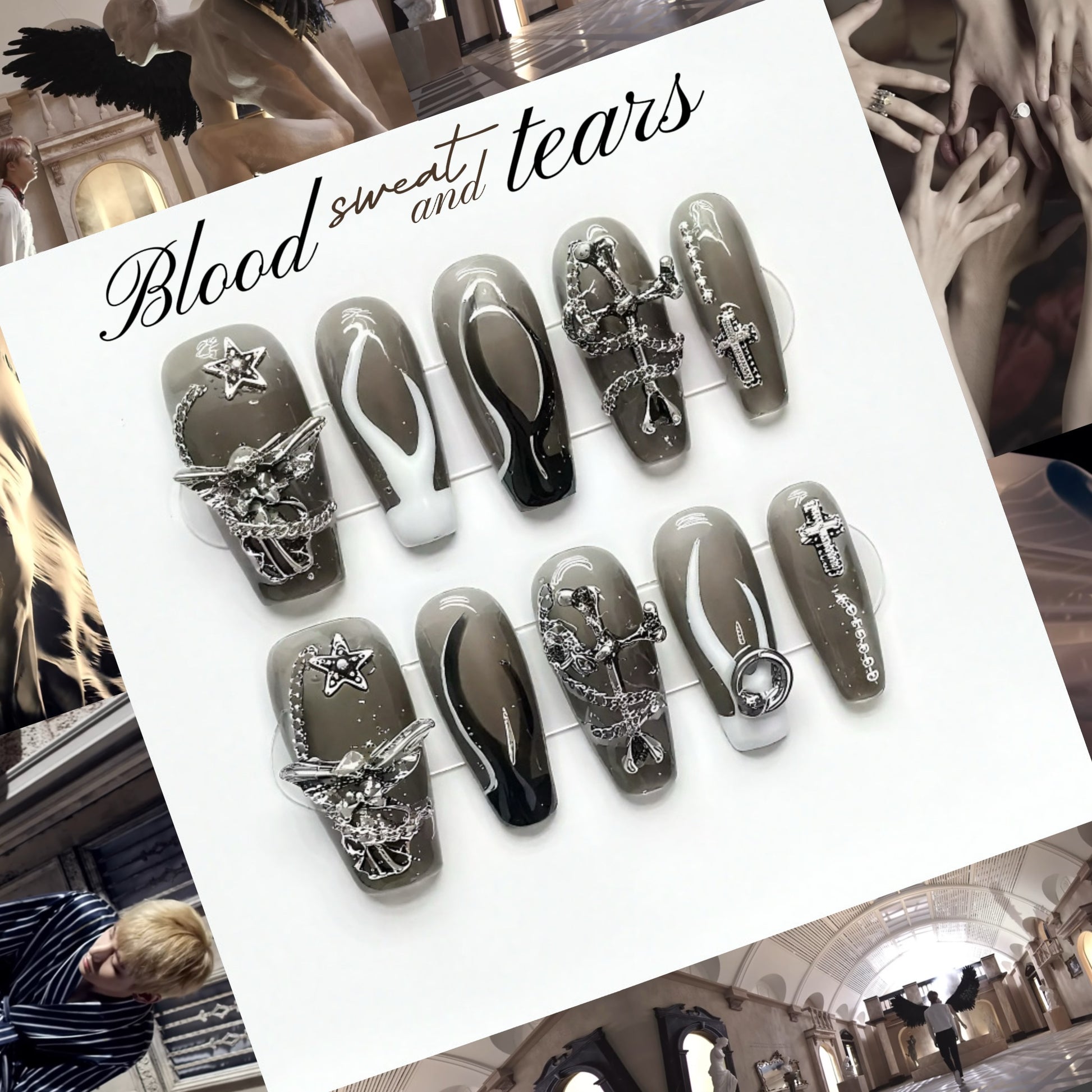Blood Sweat and Tears is a handmade press-on nails set designed by yoonmi for Army and is part of the BTS collection ⋆.˚✮🎧✮˚.⋆