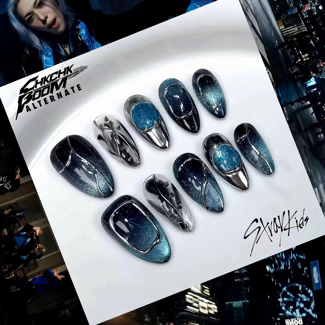 ChkChkBoom Alt. is a handmade press-on nails set designed by yoonmi for stays and is part of the STRAYKIDS collection ⋆.˚✮🎧✮˚.⋆
