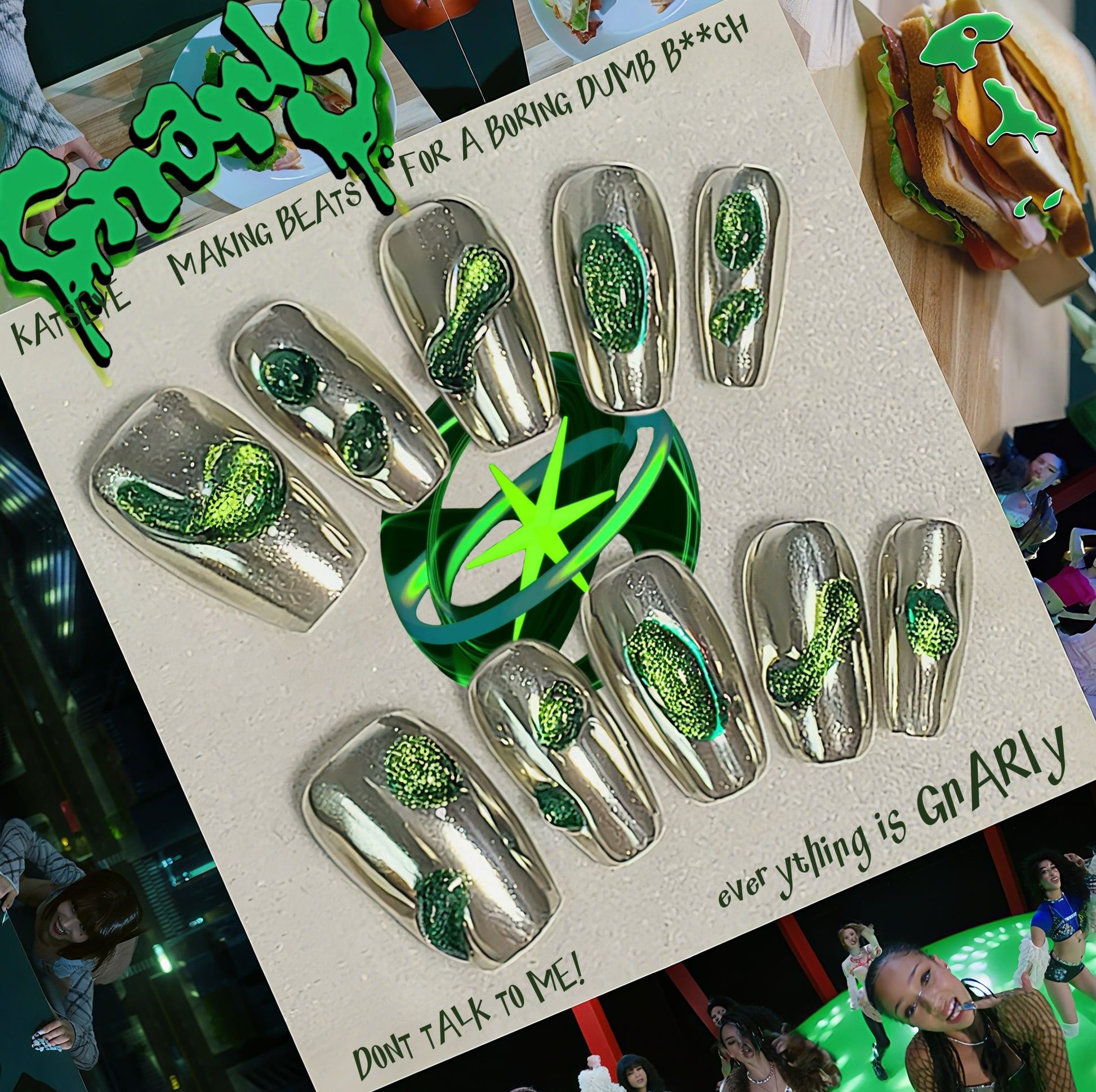 GNARLY is a handmade press-on nails set designed by yoonmi for eyekons and is part of the KATSEYE collection ⋆.˚✮🎧✮˚.⋆