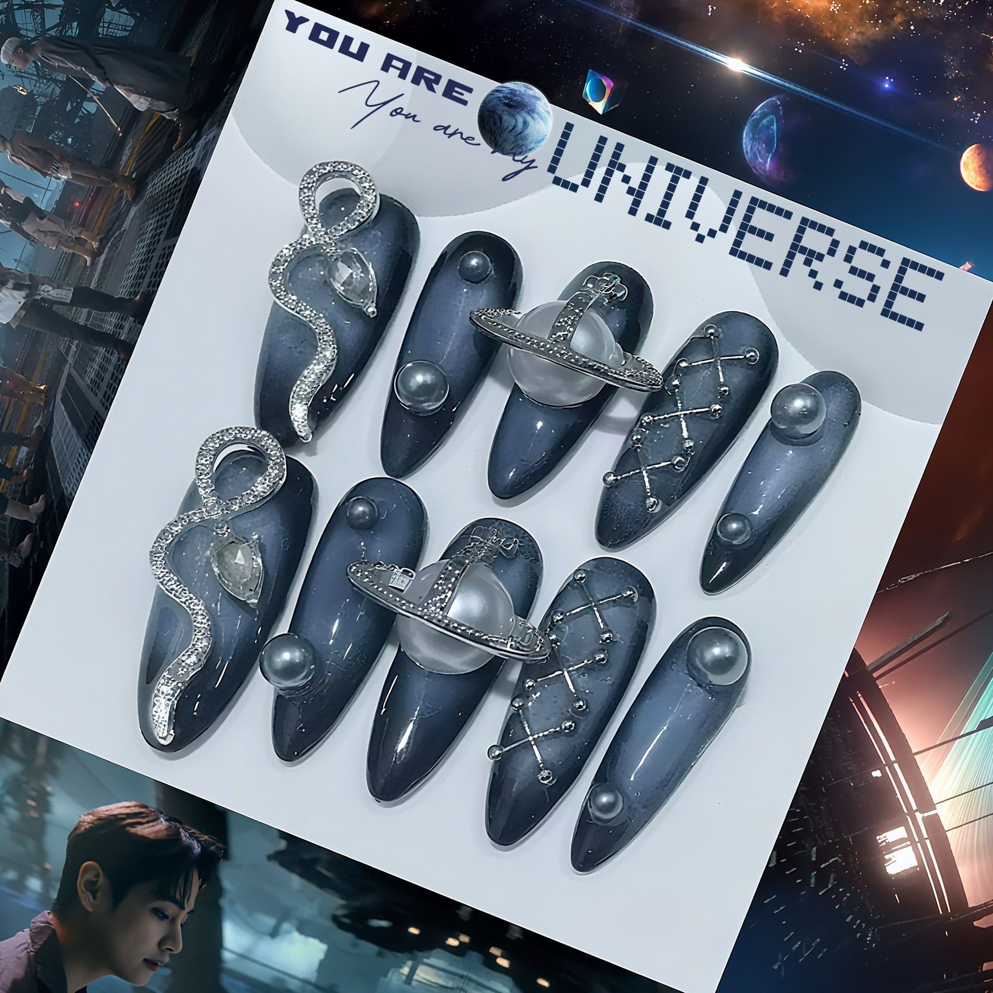 My Universe is a handmade press-on nails set designed by yoonmi for Army and is part of the BTS collection ⋆.˚✮🎧✮˚.⋆