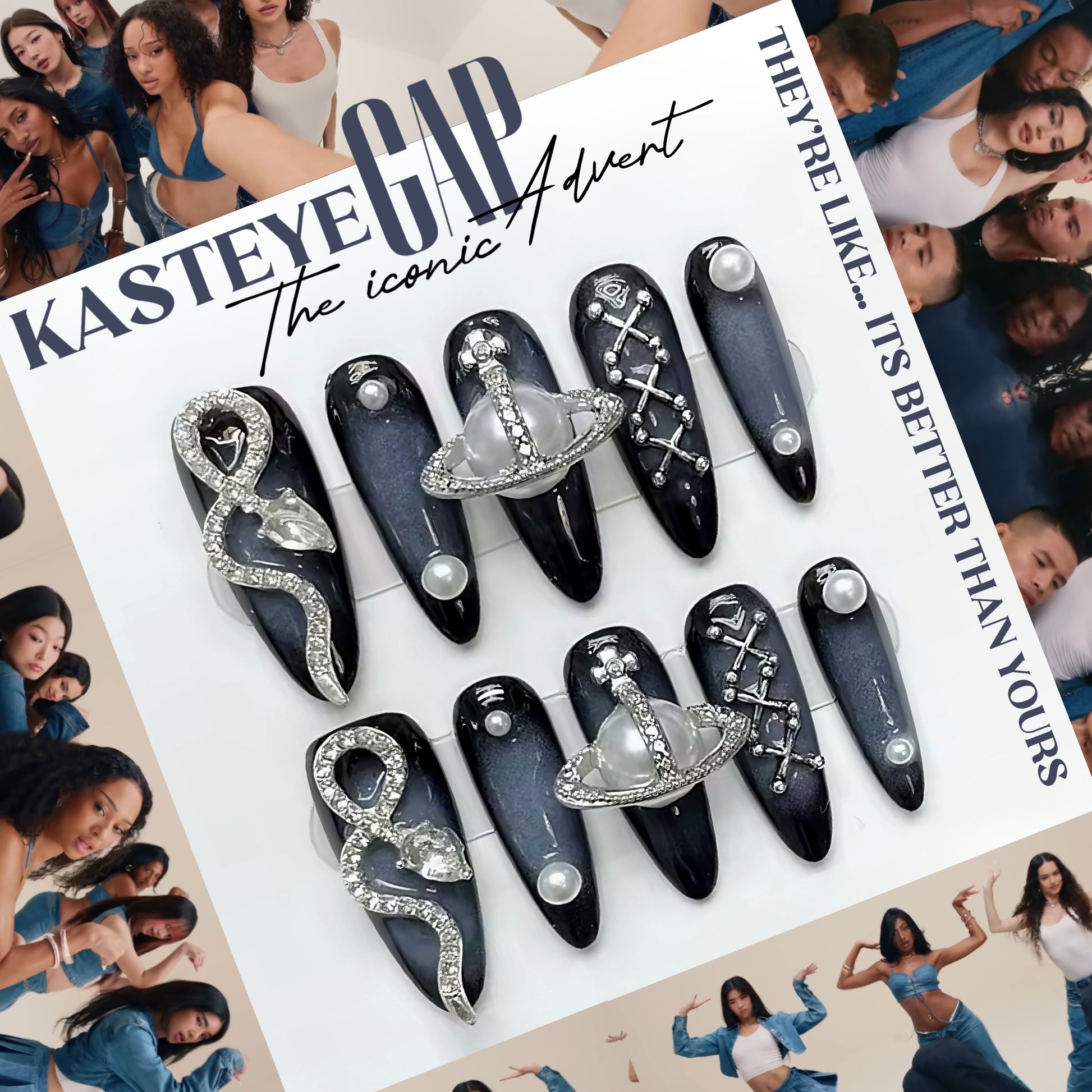 The GAP Ad.  is a handmade press-on nails set designed by yoonmi for eyekons and is part of the KATSEYE collection ⋆.˚✮🎧✮˚.⋆